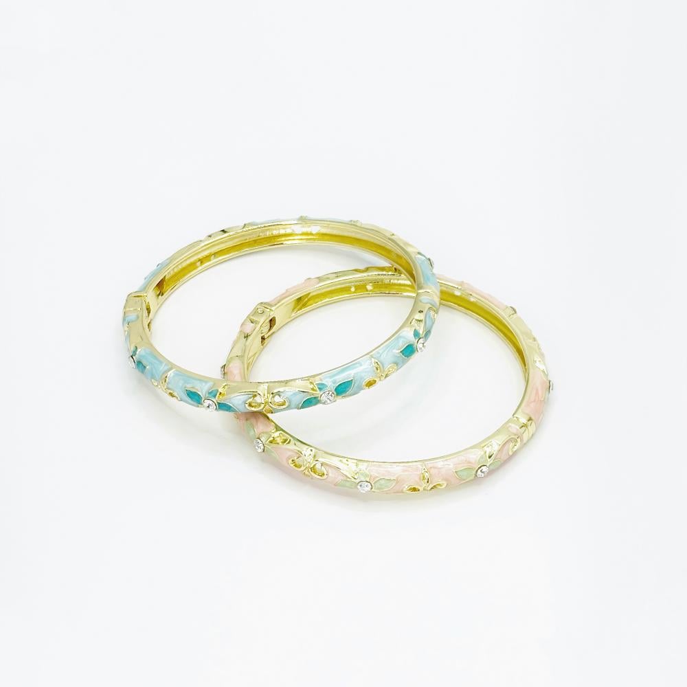 بناجر أنيقة مطلية بالذهب بتصميم عصري مميز، مزينة بزهور ملونة باللونين الوردي والأزرق مع لمسات من الفصوص الكريستالية البراقة لإطلالة حيوية تجمع بين الأناقة والنعومة.