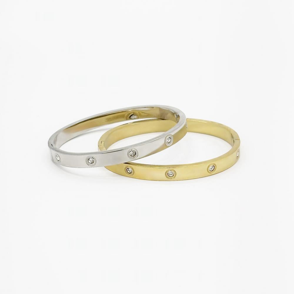 سوار فاخر مصنوع من ستانلس ستيل عالي الجودة المقاوم للصدأ والتآكل، مطلي بعناية لإطلالة راقية تدوم. مرصع بفصوص كريستال لامعة تمنحه بريقاً يخطف الأنظار، يتوفر باللونين الذهبي والفضي ليتناسب مع جميع الأذواق والإطلالات، سواء رسمية أو عصرية. تصميمه العملي يجعله إضافة مثالية لمجموعتك أو خياراً مميزاً كهدية أنيقة