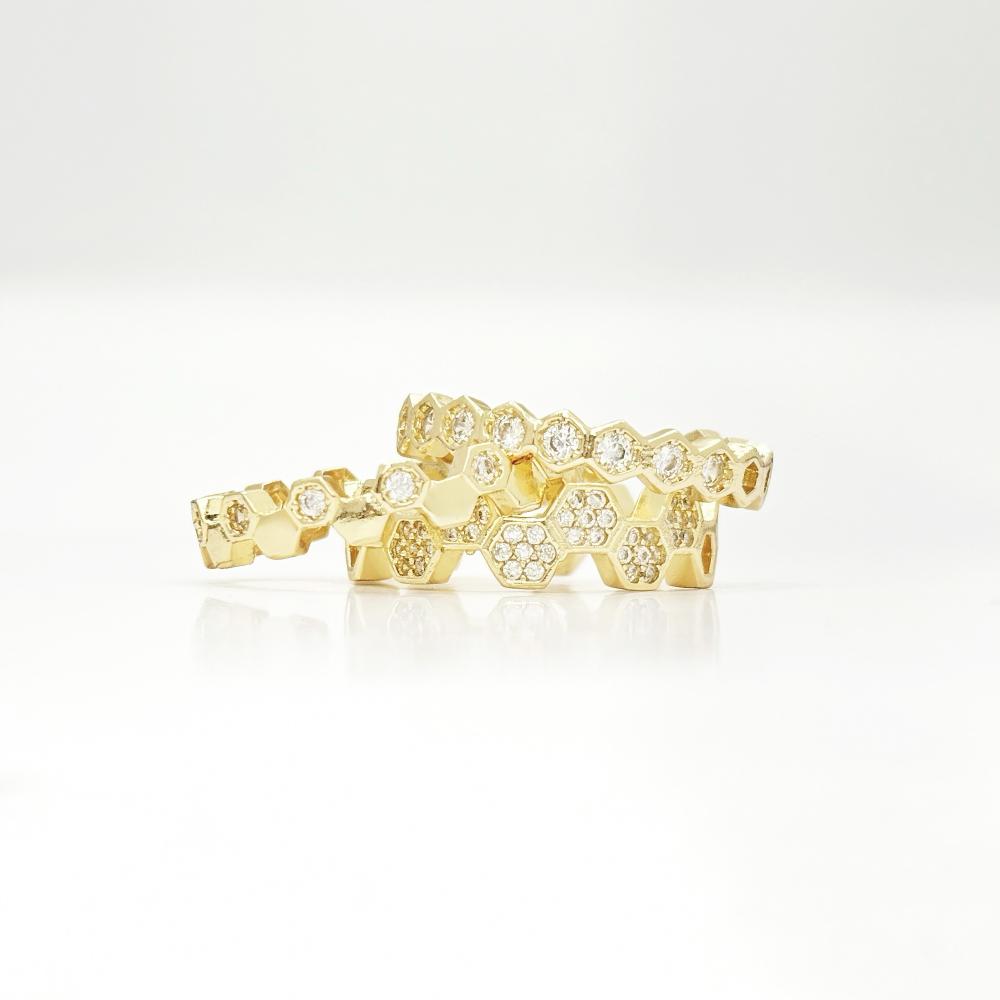 طقم خواتم شوميه باللون الذهبي ، تصميم فاخر مستوحى من خلايا النحل، مرصع بفصوص زركون لامعة تعكس أناقة عصرية بلمسة فاخرة.