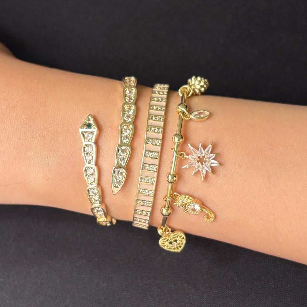 تشمل ثلاثة اساور مطليه جميعها مرنه ويمكن التحكم بمقاسها وتشمل المقاسات من XS الى L