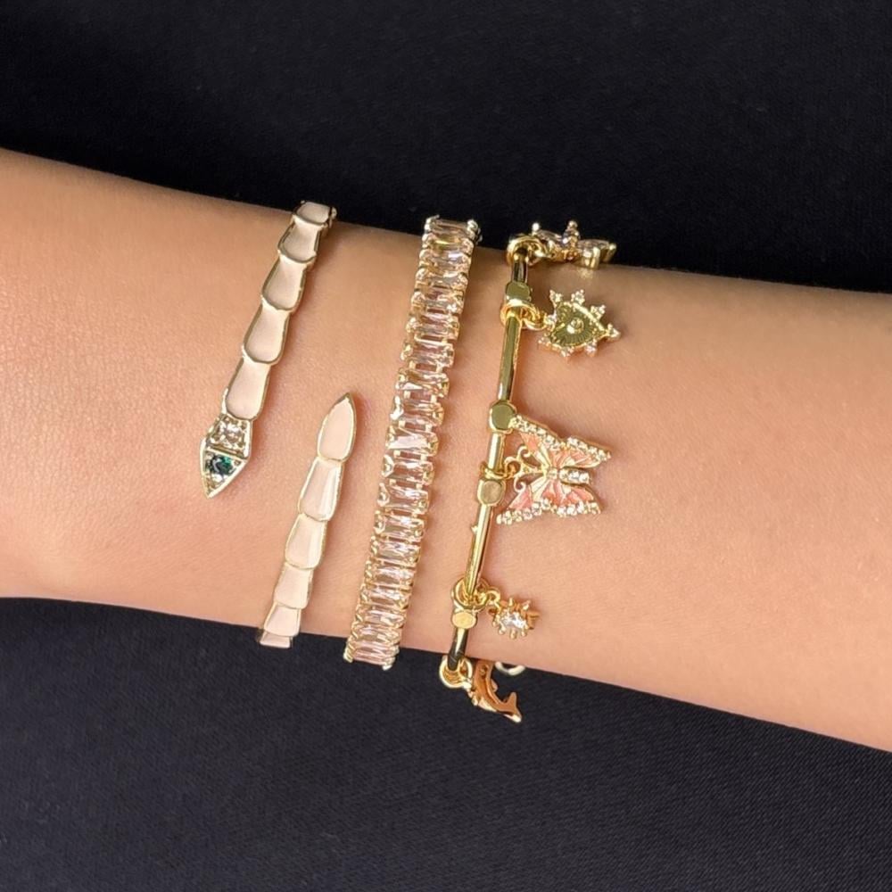 ‏ تشمل ثلاثة اساور مطليه جميعها مرنه ويمكن التحكم بمقاسها وتشمل المقاسات من XS الى L