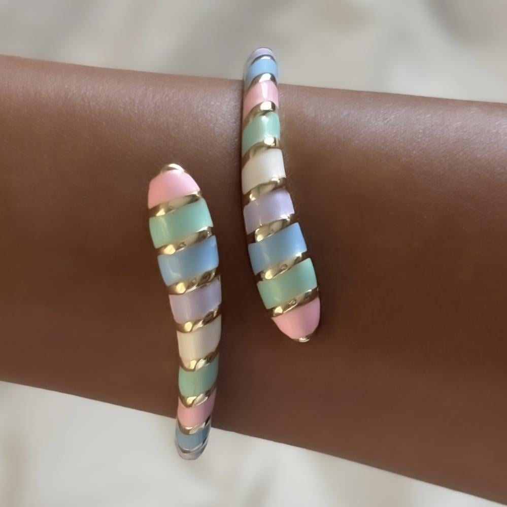 سوار فاخر مطلي، يتميز بتصميمه المفتوح المرن الذي يجعله مناسبًا لمجموعة واسعة من المقاسات ابتداءً من XS حتى L ، مما يضمن ملاءمته لمعظم الأيدي براحة وأناقة.