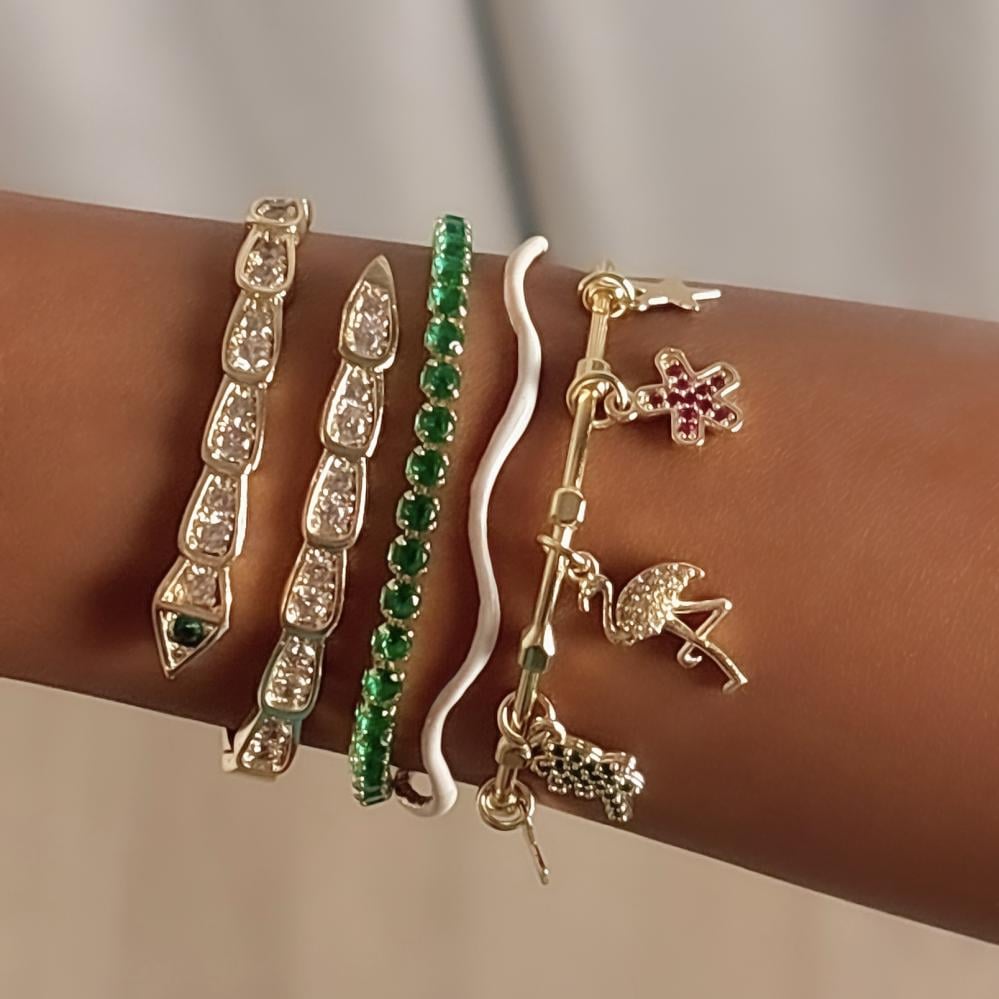 مجموعة flamingo باللون الذهبي تشمل أربع اساور ذهبيه مطليه ( سوار مموج ابيض، سوار دناديش flamingo، سوار ثعبان ذهبي، سوار انسيال تنس نحيف اخضر ) جميعها مرنه ويمكن التحكم بمقاسها وتشمل المقاسات من XS الى L