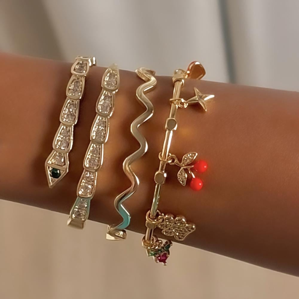 ‏ تشمل ثلاثة اساور ذهبيه مطليه ( سوار معرج ذهبي، سوار دناديش Love، سوار ثعبان ذهبي ) جميعها مرنه ويمكن التحكم بمقاسها وتشمل المقاسات من XS الى L